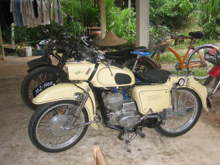 奥の黒いバイクも、手前のクリーム色のバイクもメーカー不詳です。。